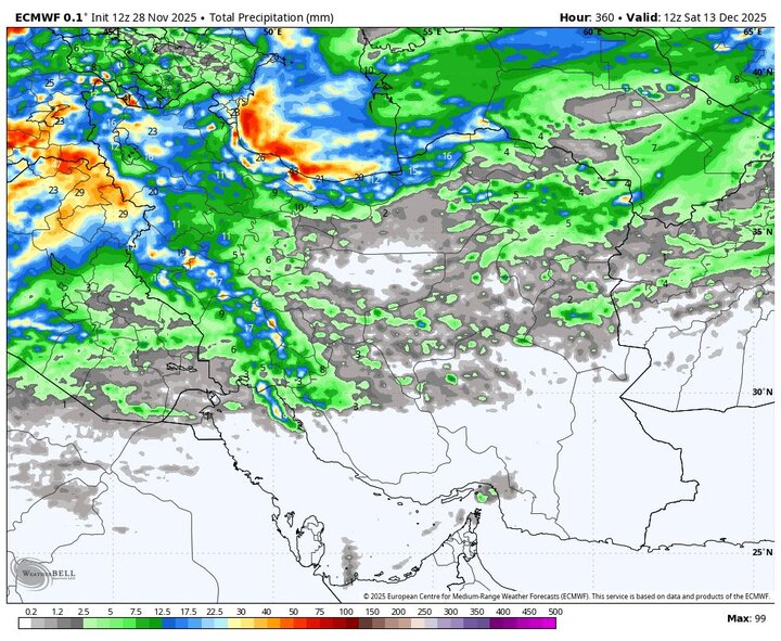 ضیائیان بیان کرد: فردا (چهارشنبه، ۱۹ آذر) گستره بارشها به استانهای آذربایجان شرقی و غربی، اردبیل، گیلان، کردستان، زنجان، قزوین، البرز، تهران، کرمانشاه، ایلام، خوزستان، چهارمحالوبختیاری، کهگیلویهوبویراحمد، شمال فارس، غرب اصفهان، همدان، مرکزی و قم گسترش مییابد. طی این روز بارش در لرستان، ایلام، شمال خوزستان، چهارمحالوبختیاری، کردستان و آذربایجان غربی شدت بیشتری خواهد داشت و احتمال وقوع روانآب و سیلاب وجود دارد.