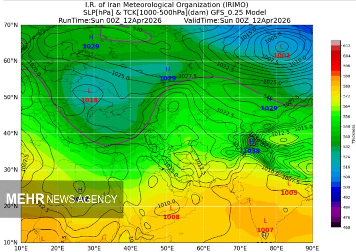 رئیس مرکز ملی پیشبینی و مدیریت بحران مخاطرات وضع هوا بیان کرد: فردا (سهشنبه، ۲۵ فروردین) بارش، وزش باد و کاهش نسبی دما در سواحل دریای خزر و خراسان رضوی تداوم خواهد داشت و در روزهای چهارشنبه (۲۶ فروردین) و پنجشنبه (۲۷ فروردین) در اغلب مناطق کشور، جوی آرام مستقر میشود.