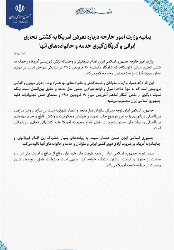 ایران ضمن هشدار نسبت به پیامدهای بسیار خطرناک این اقدام غیرقانونی و جنایتکارانه آمریکا، بر ضرورت آزادی فوری کشتی ایرانی و ملوانان و خدمه و خانوادههای آنها تأکید میکند.